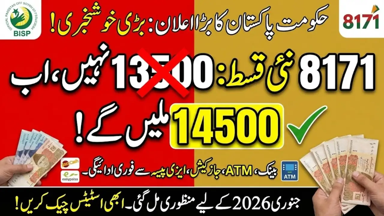 The government of Pakistan has officially approved a major enhancement in the Benazir Kafalat Program under the 8171 initiative, increasing the quarterly installment from Rs 13,500 to Rs 14,500, effective January 2026. Although the adjustment becomes active in 2026, the announcement was made in late 2026 to give beneficiaries enough time to prepare.
