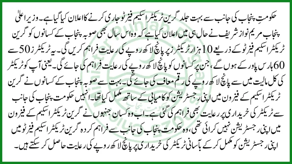 The Punjab government has announced the launch of the Green Tractor Scheme Phase II very soon. Punjab Chief Minister Maryam Nawaz Sharif has recently announced that this year too, she will provide a subsidy of Rs. 500,000 on 10,000 tractors to the farmers of Punjab province through the Green Tractor Scheme Phase II. These tractors will be of 50 to 60 horsepower, for which the farmers will be provided a subsidy of Rs 500,000. That is, you will be exempted from the total cost of the tractor by paying Rs 500,000.