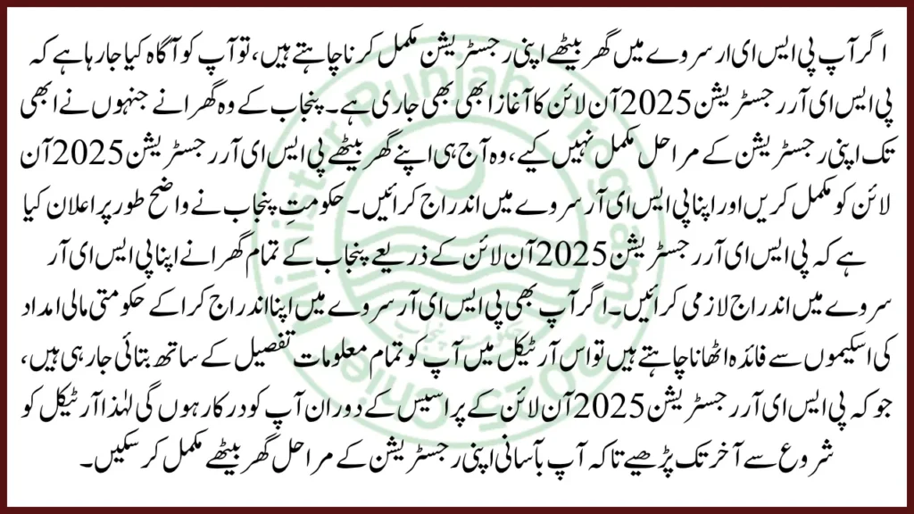 If you want to complete your registration for the PSER survey from home, please be informed that the PSER Registration 2025 Online is still ongoing. Those households of Punjab who have not yet completed their registration steps should complete PSER Registration 2025 online from home today and register themselves in the PSER survey.