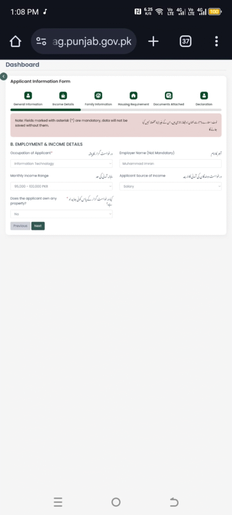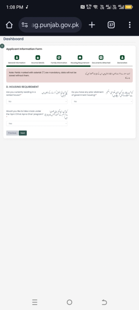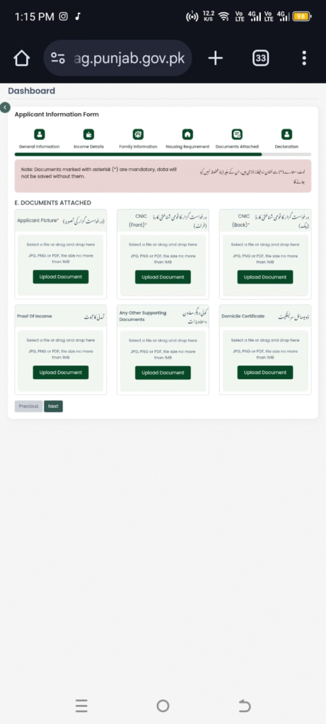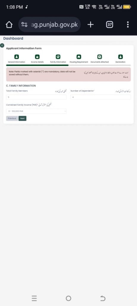 After logging in, access the application form and provide your personal and family details. This includes your full name, CNIC number, marital status, family income, and the district you are applying from. You’ll also need to confirm that you meet all the eligibility conditions mentioned earlier.