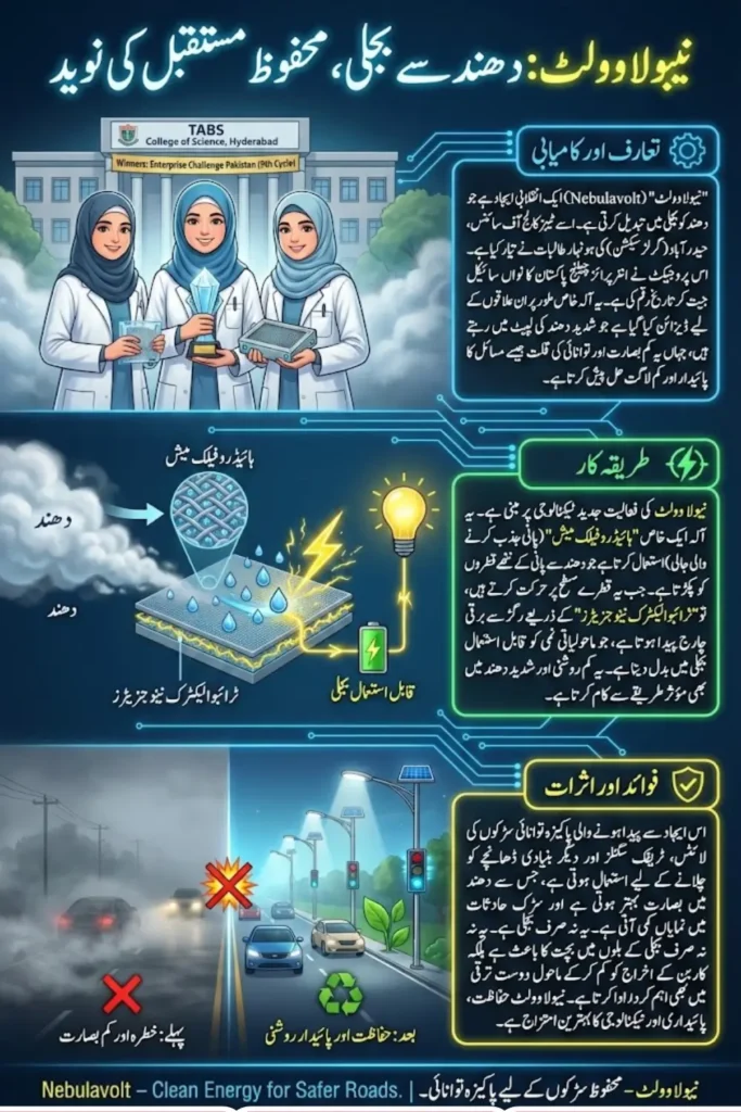 Fog-prone regions often struggle with low visibility and energy shortages. To address this, students from the Girls Section of TABS College of Science, Hyderabad, developed Nebulavolt, an innovative fog-to-electricity safety device. Winning the ninth cycle of Enterprise Challenge Pakistan, this project combines sustainability, safety, and technology in a single low-cost solution.