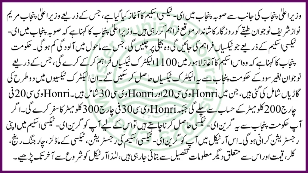 The Punjab Green E-Taxi Scheme 2025 is a government initiative launched by CM Maryam Nawaz to provide electric taxis to unemployed youth on interest-free loans.