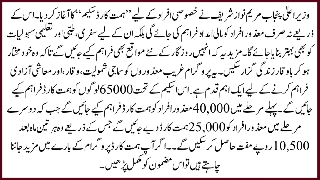 Punjab Chief Minister Maryam Nawaz Sharif has launched a “Himmat Card Scheme 2025 ” for special people. Through this, not only will financial assistance be provided to the disabled, but also travel, medical, and educational facilities will be improved for them. Moreover, they will also be provided with new job opportunities so that they can be independent and lead a dignified life.