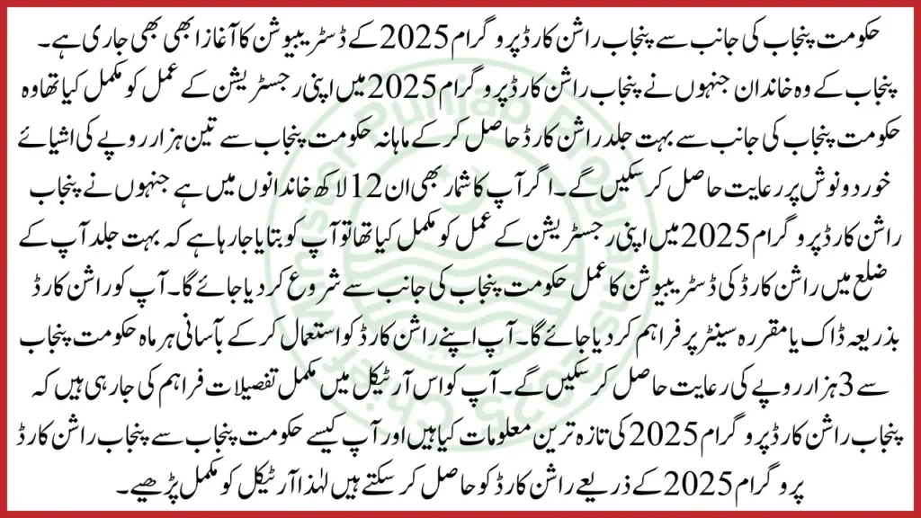 The distribution process of ration cards under this scheme is still ongoing. Families who have completed their registration process in the Punjab Ration Card Program 2025 will soon receive their cards. According to the government, cards will be provided either by post or through designated centers in each district.