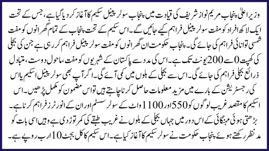 Under the leadership of Punjab Chief Minister Maryam Nawaz Sharif, the Punjab Solar Scheme 2025 has been launched, which will provide free solar panels to one lakh people. The solar panel scheme has been designed to solve the electricity problems in Punjab. Under this scheme, free solar energy will be provided to all households in Punjab.
