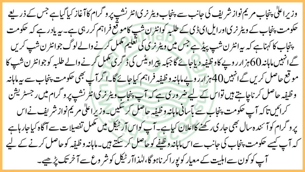It is a paid internship program launched by CM Punjab Maryam Nawaz Sharif for veterinary and para-vets students.